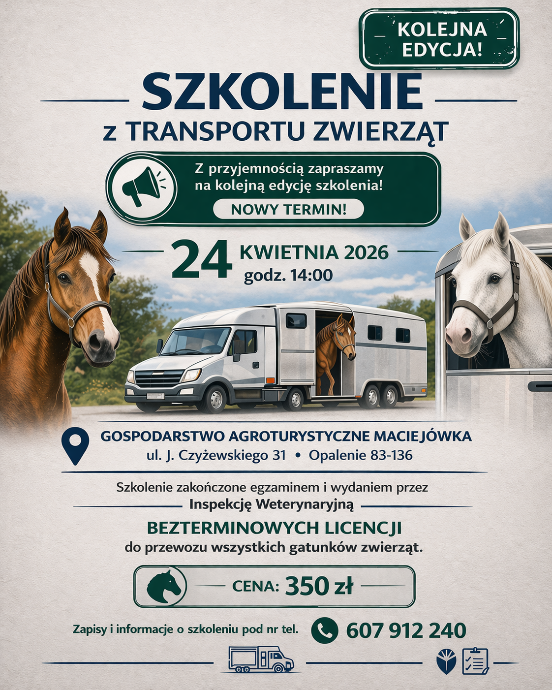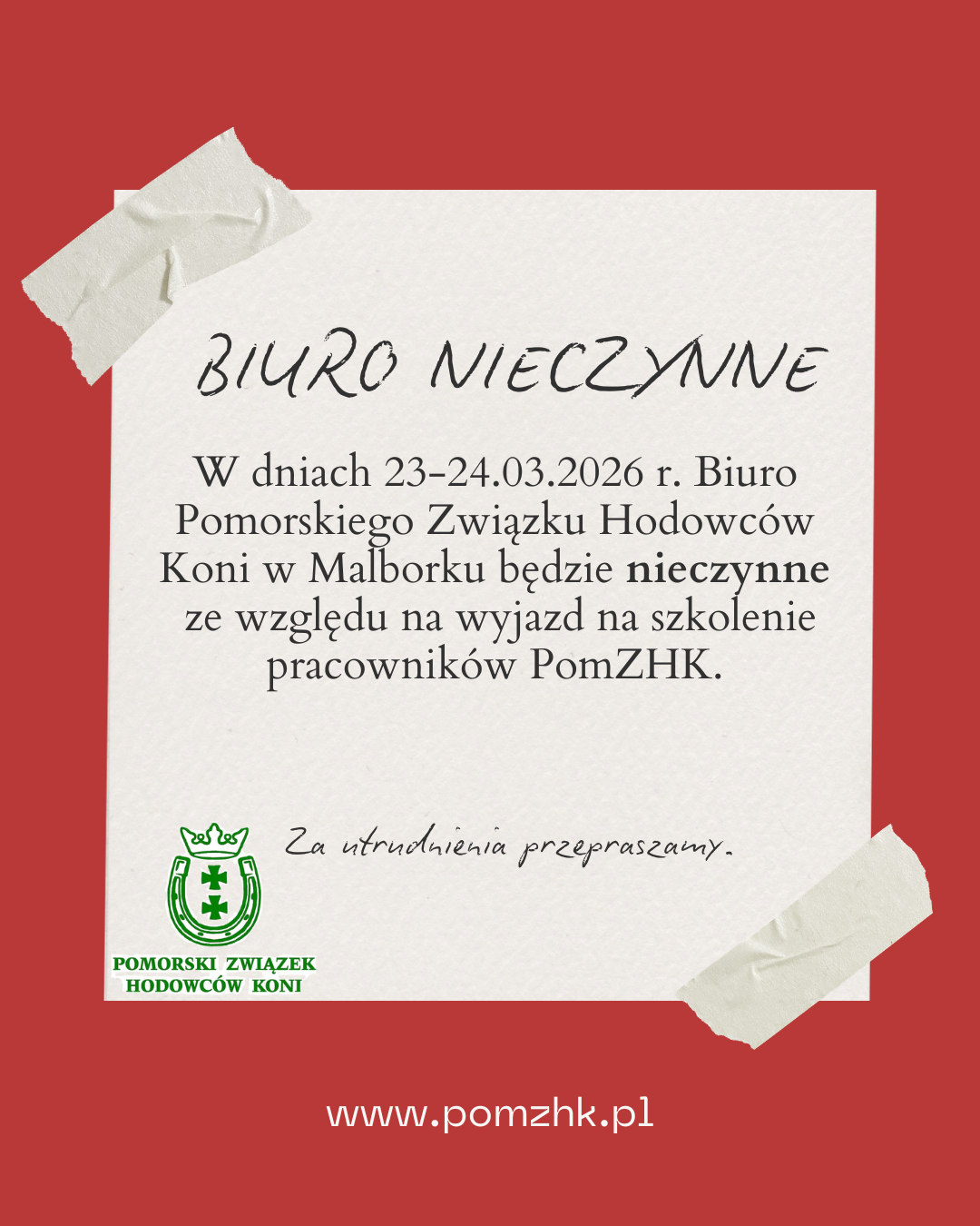 ❗️⌚️ Szanowni Państwo, informujemy, że w dniu 03.04.2026 r. w Wielki Piątek, biuro Pomorskiego Związku Hodowców Koni w Malborku będzie czynne od godziny 7:00 do godziny 12:00.