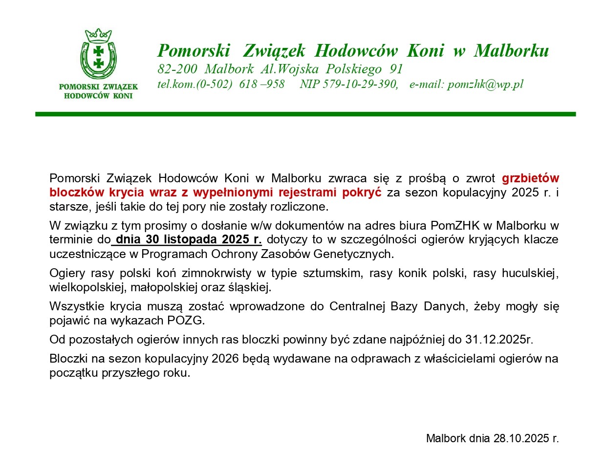 Zwrot grzbietów bloczków krycia wraz z rejestrami pokryć Napisane przez administrator dnia 30 październik 2025. Wysłane Uncategorised. Szanowni Państwo, przypominamy o zwrocie grzbietów bloczków krycia wraz z wypełnionymi rejestrami pokryć za rok 2025 Tagi: Konie Zimnokrwiste, Konie Szlachetne, Konie prymitywne i małe Kliknięć: 248 Drukuj Poprzedni artykuł Następny artykuł