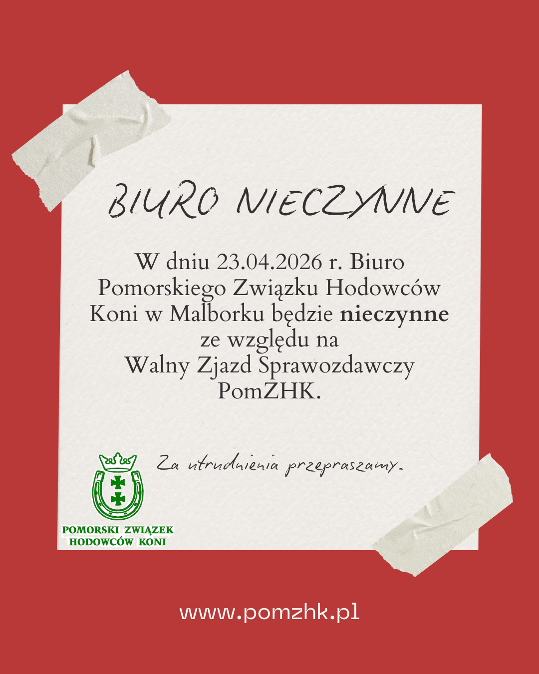 BIURO NIECZYNNE 23.04.2026 r. - Walny Zjazd Sprawozdawczy Napisane przez administrator dnia 22 kwiecień 2026. Wysłane Uncategorised. Tagi: Konie Zimnokrwiste, Konie Szlachetne, Konie prymitywne i małe Kliknięć: 7 Drukuj Następny artykuł
